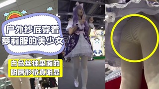 户外抄底穿着萝莉服的美少女,白色丝袜里面的阴唇形状真明显。