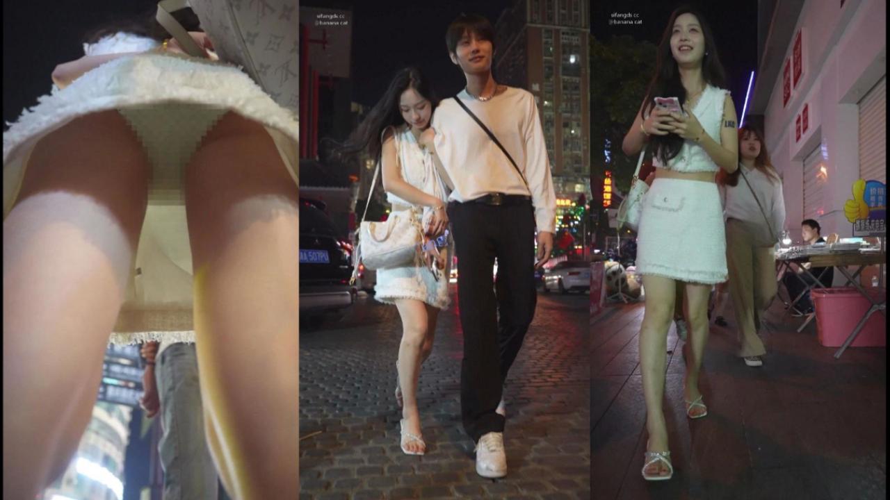 抄底超短白色牛仔裙小姐姐逛街,穿白色骚气丁字裤